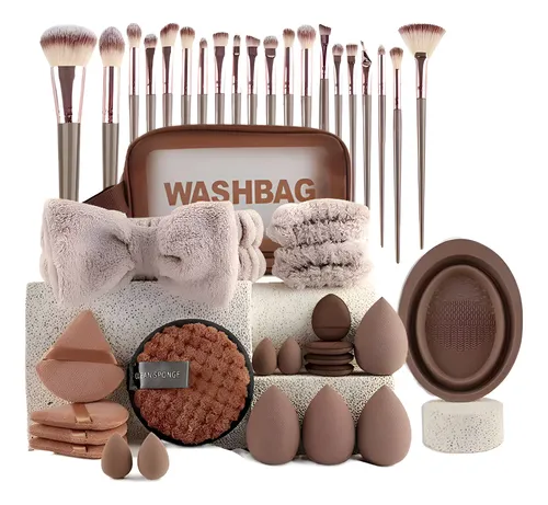 Makeup Brush Set with Sponges Cleansing Pads Headband Wristbands-Coffee