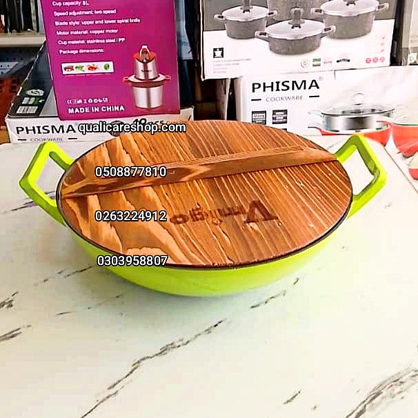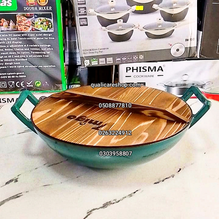 FRYING PAN - 36CM ENAMEL CAST IRON WOK PAN WITH WOODEN LID
