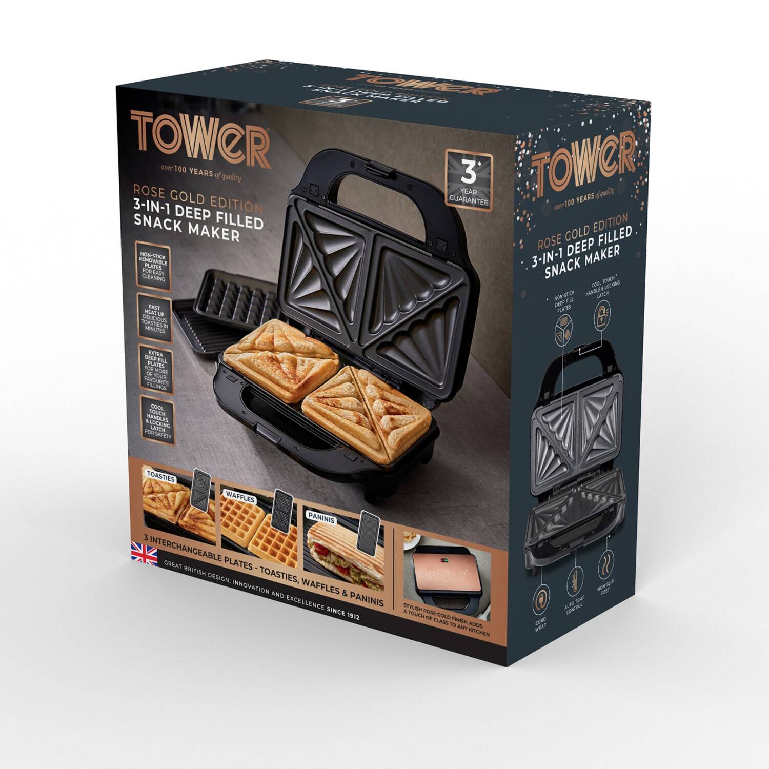 Sandwich Maker - Tower Rose Gold Edition 3 in 1 Deep Filled Snack Maker (toast, waffles, paninis